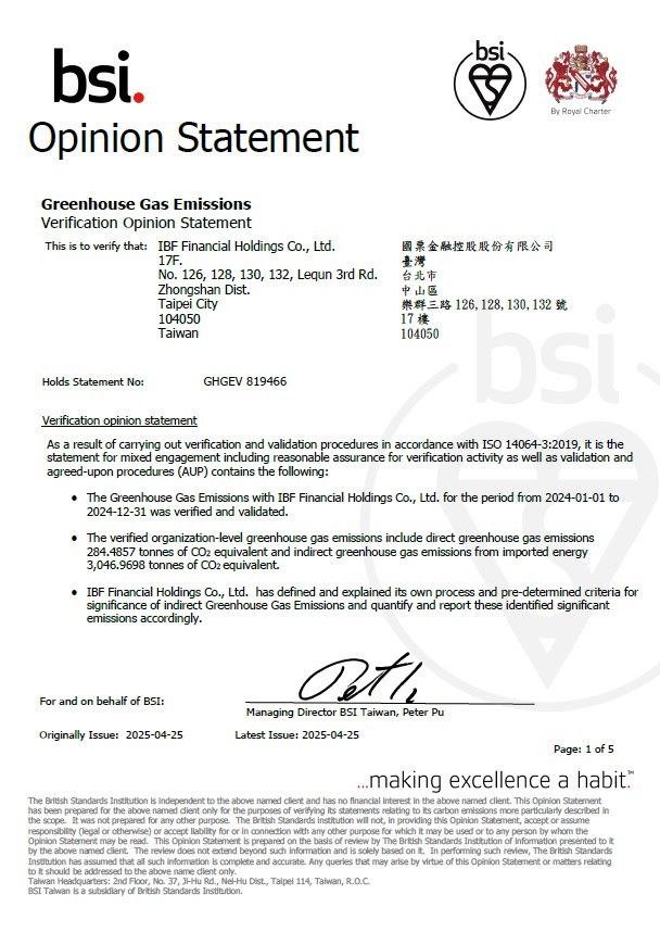 國票金控2021年至2024年皆通過ISO 14064-1溫室氣體盤查、2022年起取得ISO 14001環境管理系統及ISO 50001能源管理系統認證,原始證書起迄期間2022年12月15日~2025年12月14日,續審證書起迄期間:2025年12月15日至2028年12月14日。 ISO 14064-1 溫盤查證證書 ISO 14001 環境管理系統認證證書 ISO 50001 能源管理系統認證證書